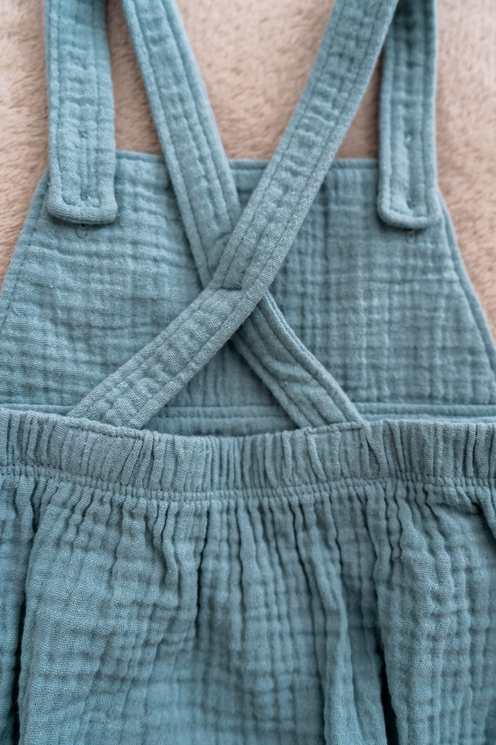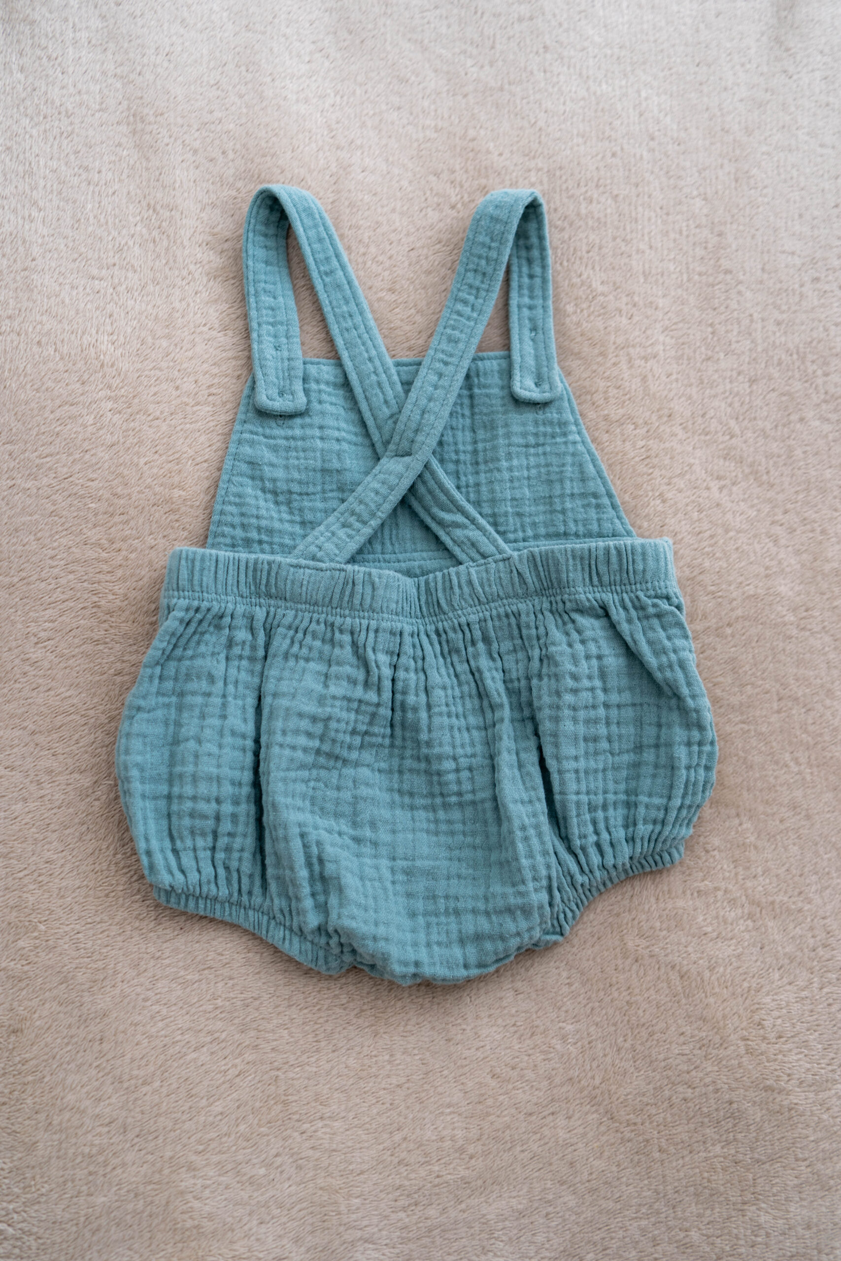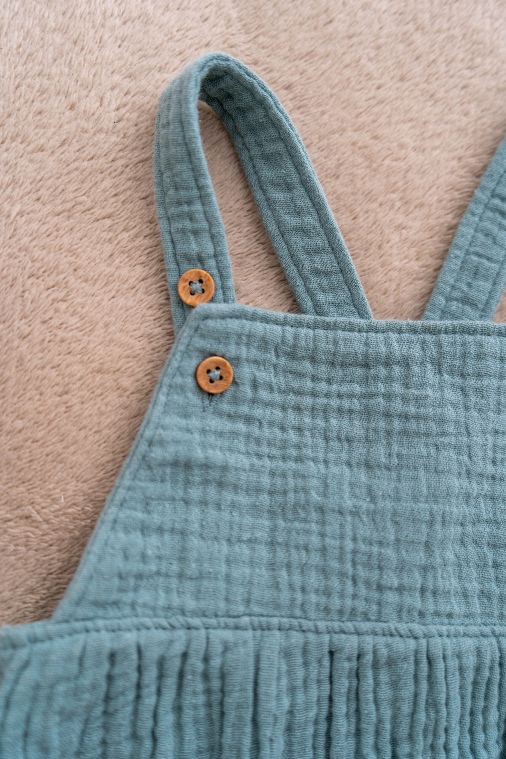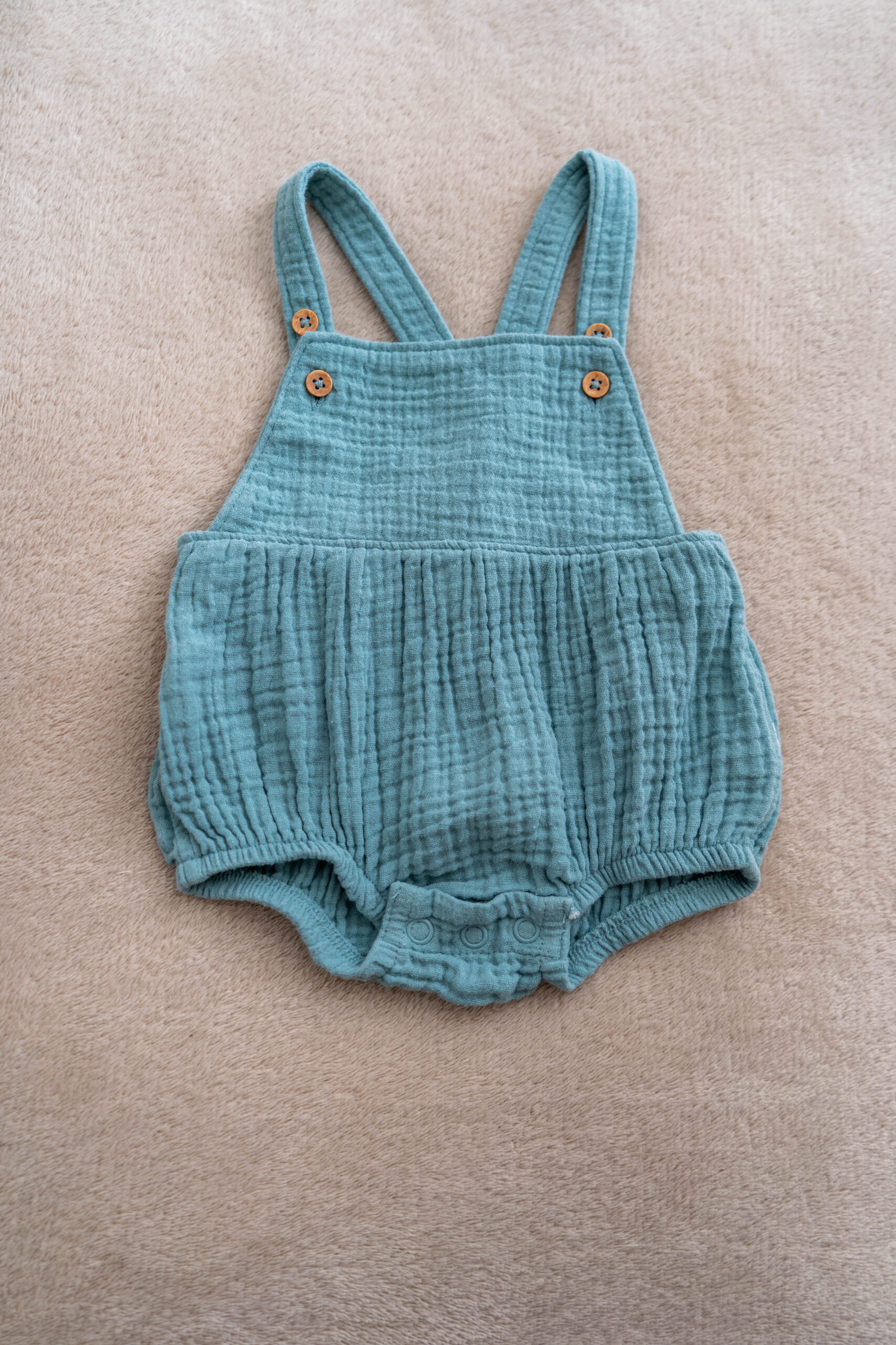 The straps feature natural wooden buttons, while the gathered waist and leg openings provide comfort and shape. The snap closures at the bottom make changes quick and easy — perfect for busy toddlers or little explorers on the go.