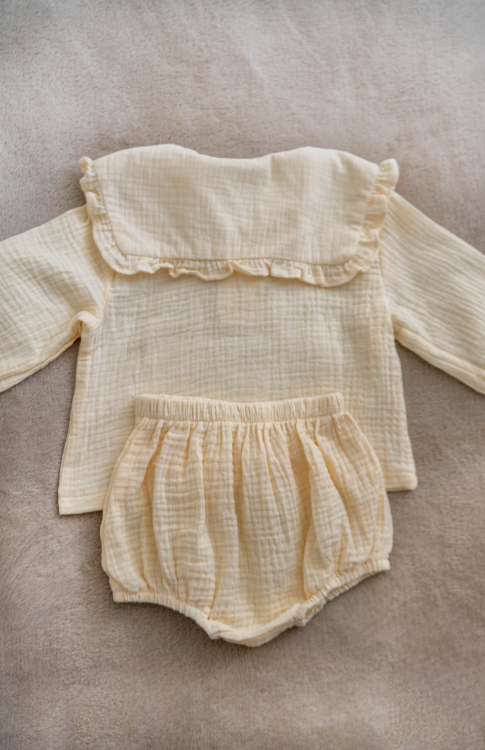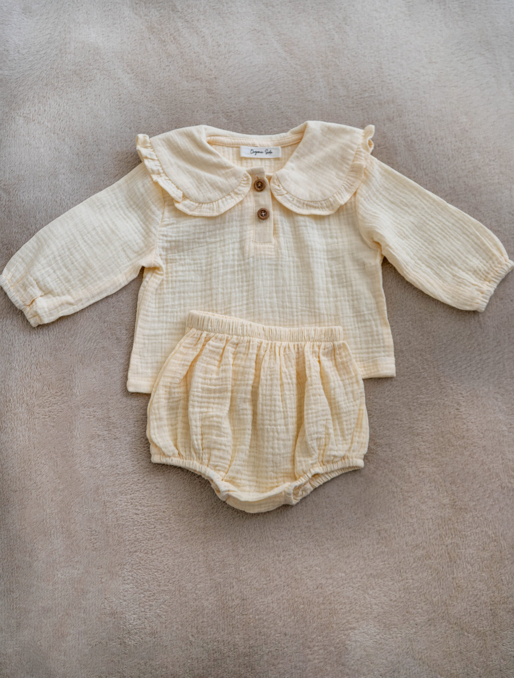 The top features long sleeves, a rounded ruffle collar, and a button-up neckline for easy dressing. Paired with adorable bubble-style bloomers with a gentle elastic waistband and cuffs, this outfit moves with your baby and allows for layering as seasons change.