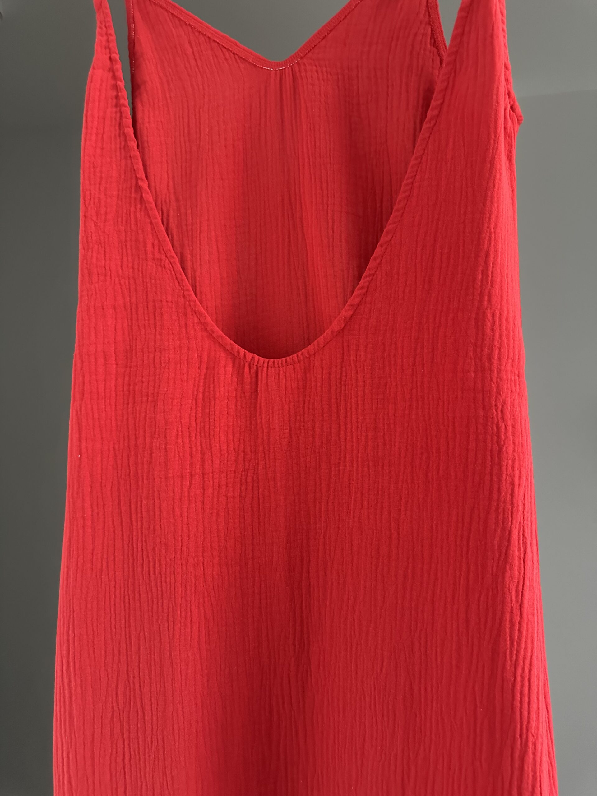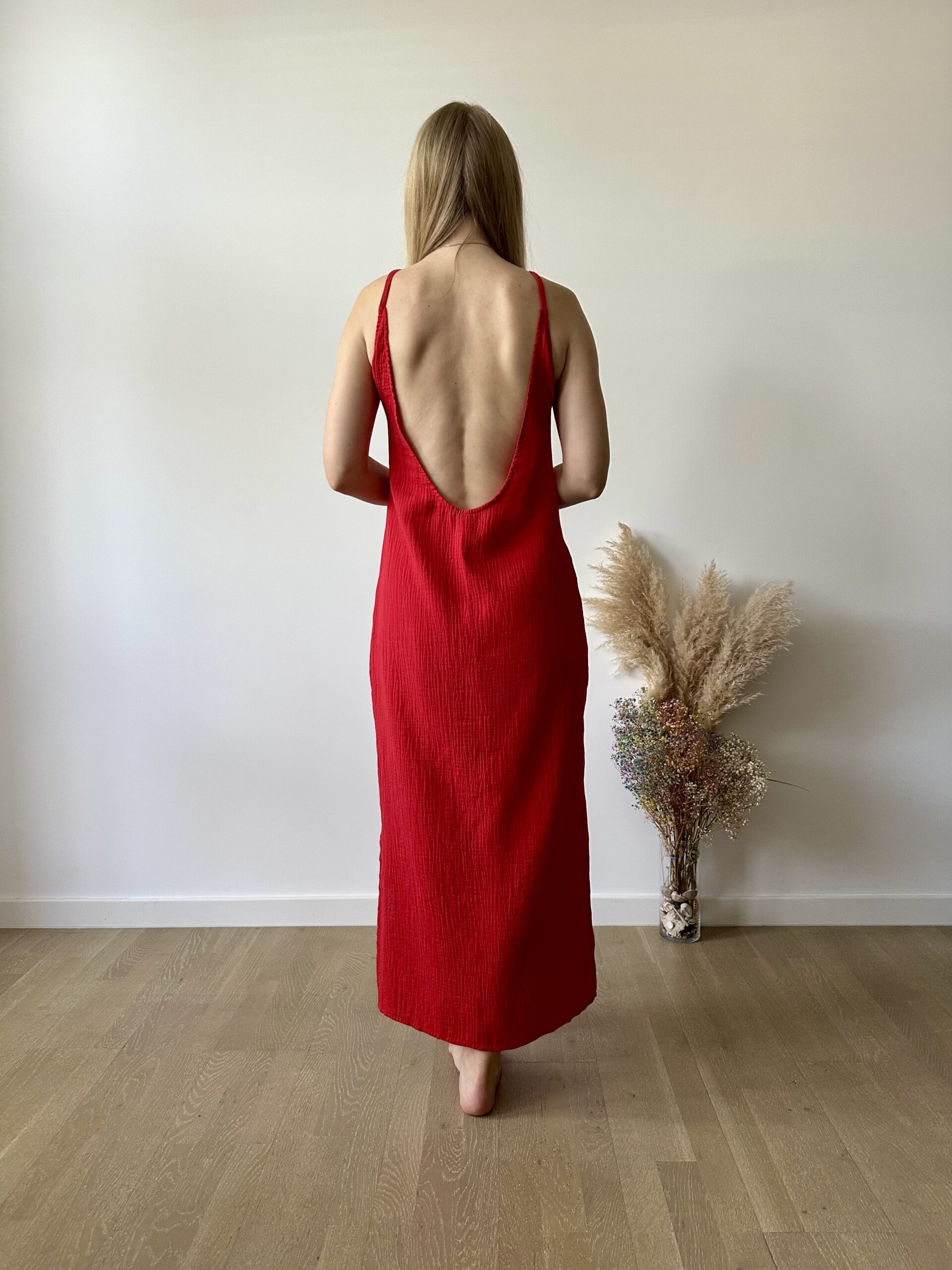 This muslin slip midi dress is a summer dream made real. Designed with simplicity and sustainability in mind, it’s made from double-layered, ultra-soft cotton muslin — a naturally breathable and lightweight fabric known for its gentle feel and effortless drape.