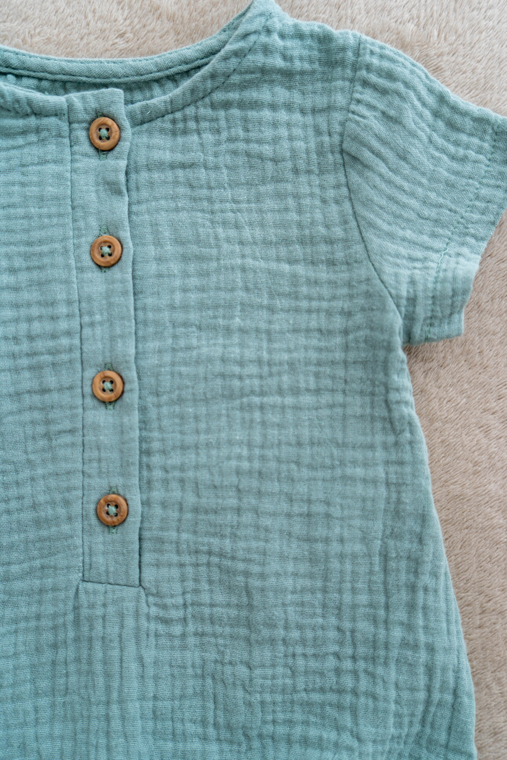 With a relaxed fit, short sleeves, and soft elastic hems, this jumpsuit encourages exploration, napping, and everything in between. Wooden buttons down the front make dressing a breeze, while bottom snaps ensure quick diaper changes on the go. Earthy tones and subtle texture make it a go-to staple for modern parents who value comfort and simplicity.